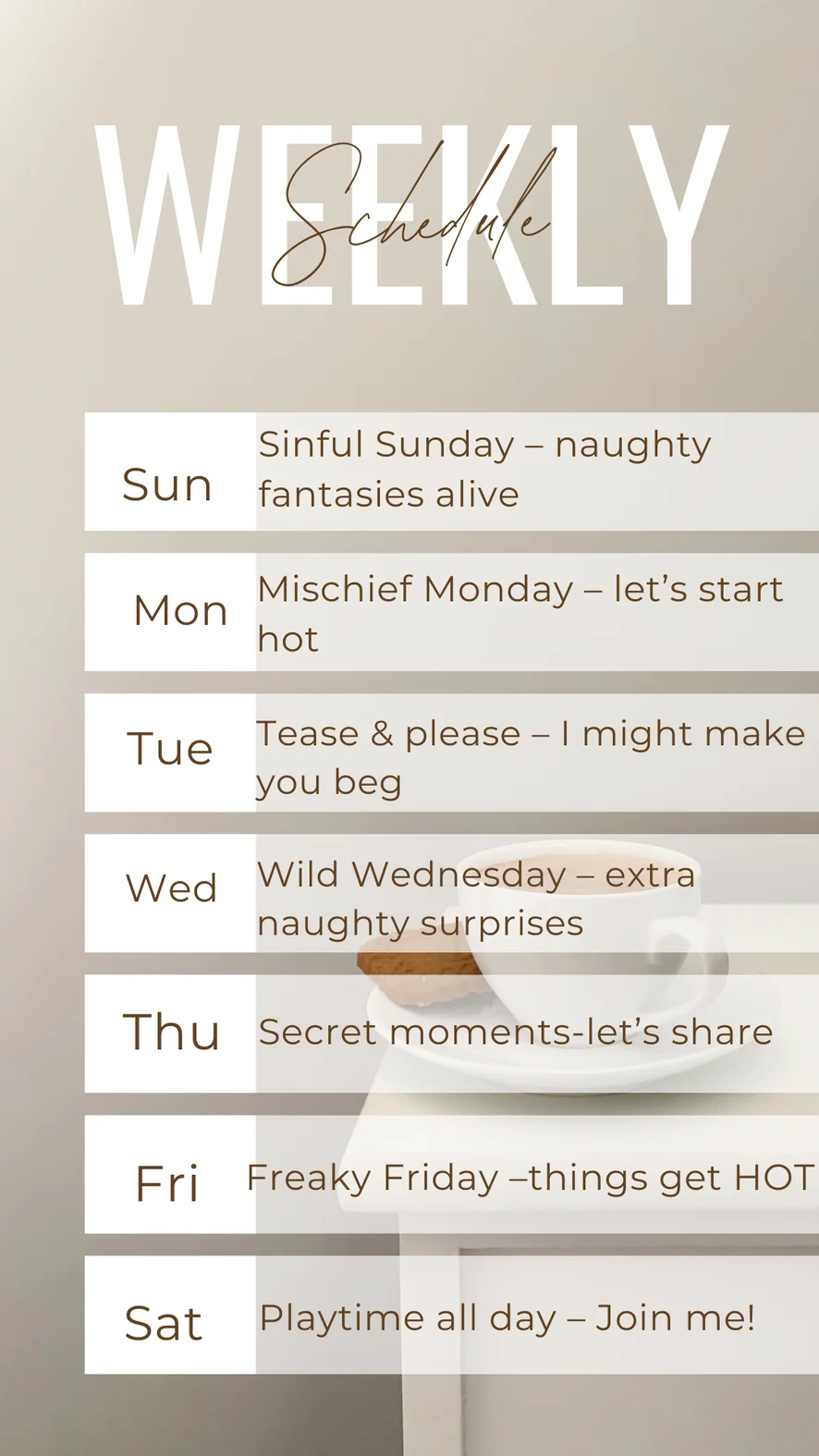 Ahegao, Camel Toe, Kalu-luokitus, Lehmityttö, Eroottinen tanssi, Nailon, Vilauttelu, Suihinotto, Syväkurkku, Dildo tai vibraattori, Tuhmat puheet, Doggy Style, Sormetus, Jalkaseksi, Korkokengät, Twerkkaus, Yläosattomissa, Nöyryytys, Öljyesitys, Roolileikki, Seksilelut, Strippaus, Tissipano, Runkkaus, Selkäsauna, Jalkafetissi, Runkkausohjeet, Masturbointi, Orgasmi